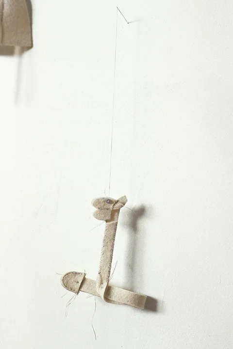 I made a bird, a fish, a figure with cadet’s hat and rascal’s smile, a worm, followed by another glove. They were either pinned directly to the wall or dangled like the chick. They were built around an interior space, with no additional interior support, and had something to do with the hand. I placed them at different heights in relation to one another and began to think of them both as notes on an invisible staff and snowflakes in unexpected configurations because they were white and because felt muffles sound like snow. A musical score for silence.