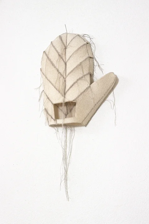 Several Christmas-es ago, my husband received a gift of gloves. The shape of the double reinforced palm captured my attention, and I drew one of them. I ‘saw’ the drawing in cream colored industrial wool felt and constructed it by first cutting up the drawing to make a pattern -- some form of destruction seems an aspect of my process -- and then sewing the felt together with the same pale grey silk thread I’d been using in my paper pieces. Silk thread and the stitched line have been consistent elements in my work. I struggled with the thumb. How to make it stick out at the appropriate angle? I pinned it to the wall through the index finger. Ouch! Though I made the glove be a glove again, still it wasn’t a glove one could actually wear. Was it an idea of a glove? It was white. Magician’s glove? Ghost of a glove?