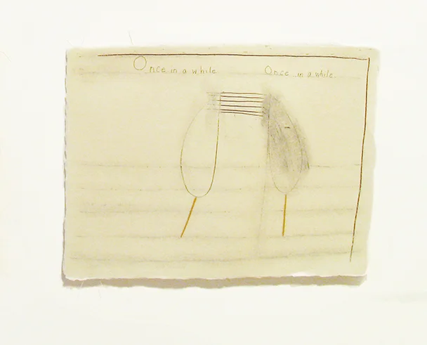 The drawings were developed from earlier works-on-paper: Very well saint, exhibited at The Drawing Center in 2000, and Cuts and Occasions, at Dieu Donné Papermill in 2002. Both projects incorporated words and phrases from Stein's writings. The drawing process begins with the stitching together of a double-layer of handmade paper. As in the three-dimensional work, the pale grey silk thread is a concrete line echoing and extending the pencil drawing - alluding to figures and vessels - into actual space. The drawings are also marked by cuts, (attempted) erasures, and the addition (or removal) of toothpicks, pearl buttons, and scraps of felt. Both felt and paper are sensitive and impressionable; whatever marks are made can never be completely eliminated. The work inevitably becomes a recording of its own coming into being.